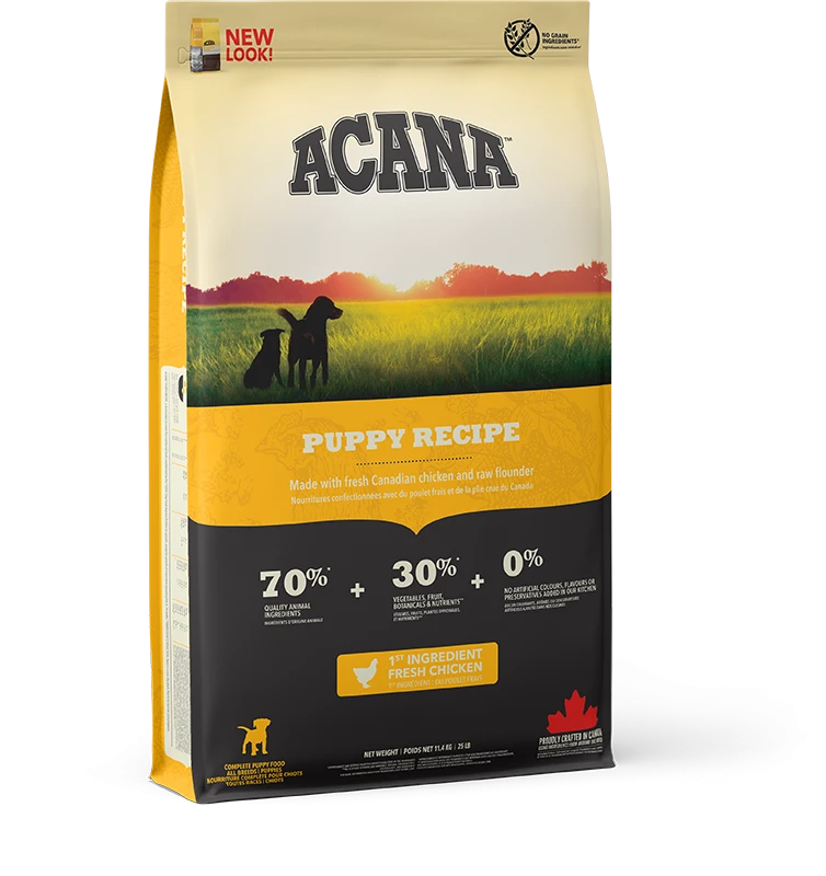 Bereid in onze gecertificeerde keukens in Canada is Acana Dog hondenvoer Puppy Recipe rijk aan lokaal gefokte scharrel kip, scharrel eieren, in het wild gevangen platvis, zongerijpt fruit en groenten – geleverd rijk aan voedingsstoffen en door boeren en telers uit onze regio zodat jouw puppy gezond, sterk en gelukkig kan zijn.