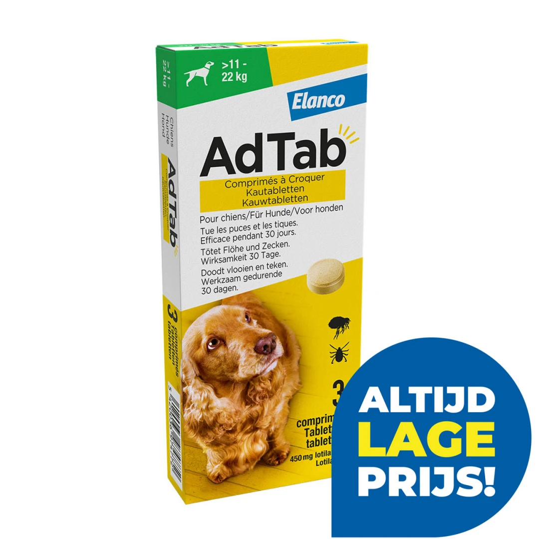 AdTab kauwtabletten doodt vlooien en teken snel gedurende 1 maand.