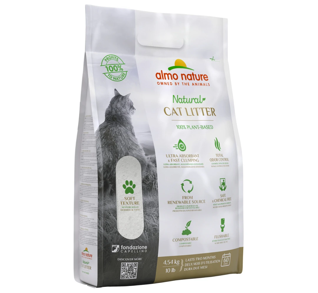 Almo Nature kattenbakvulling is een volledig natuurlijke, biologisch afbreekbare, composteerbare en doorspoelbare kattenbakvulling gemaakt van plantaardige vezels. Het zetmeel in de plantaardige vezels produceert snel klonten en de enzymen neutraliseren de geur.