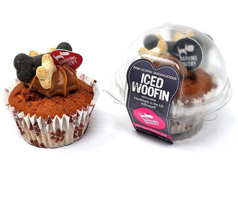 Een caloriearme carob woofin van Barking Bakery, liefdevol gegarneerd met een wervelende staartwerveling van carob gearomatiseerde yoghurtglazuur.
