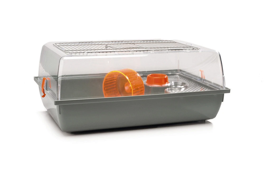 Hamsterkooi Alex in trendy opvallende kleuren. De transparante bovenkap is voorzien van een rooster. Inclusief een platform met oranje voerbakje. Tevens een looprad voor de sportieve hamster, gerbil of muis.
