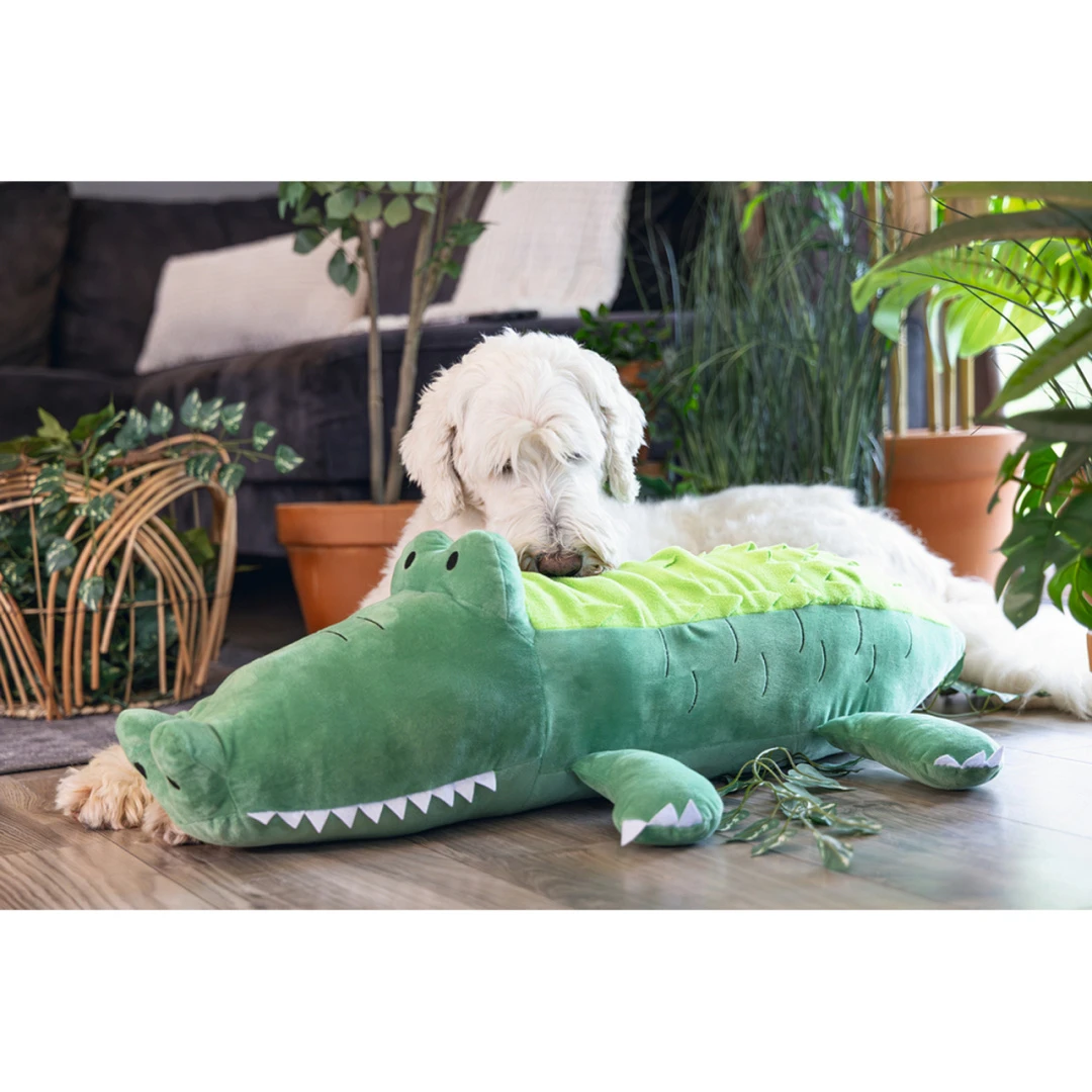 Laat je hond het avontuur van de jungle beleven met het Beeztees hondenspeeltje Hide and Seek Jungle Krokodil. Deze grote hondenknuffel in de vorm van een schattige krokodil, biedt meer dan alleen speelplezier. Het is een interactief spel waarbij je heerlijke traktaties kunt verstoppen voor je hond. De Hide and Seek functie daagt je viervoeter uit om zijn natuurlijke nieuwsgierigheid te gebruiken om de verborgen lekkernijen te vinden. Kan jouw hond de uitdaging aan en de verstopte traktaties ontdekken? Dit maakt de Hide and Seek Jungle Krokodil niet alleen een leuk knuffelspeeltje, maar ook een stimulerend denkspel dat de aandacht van je hond vasthoudt. Wist je bovendien dat 10 minuten snuffelen gelijk staat aan een lange wandeling?