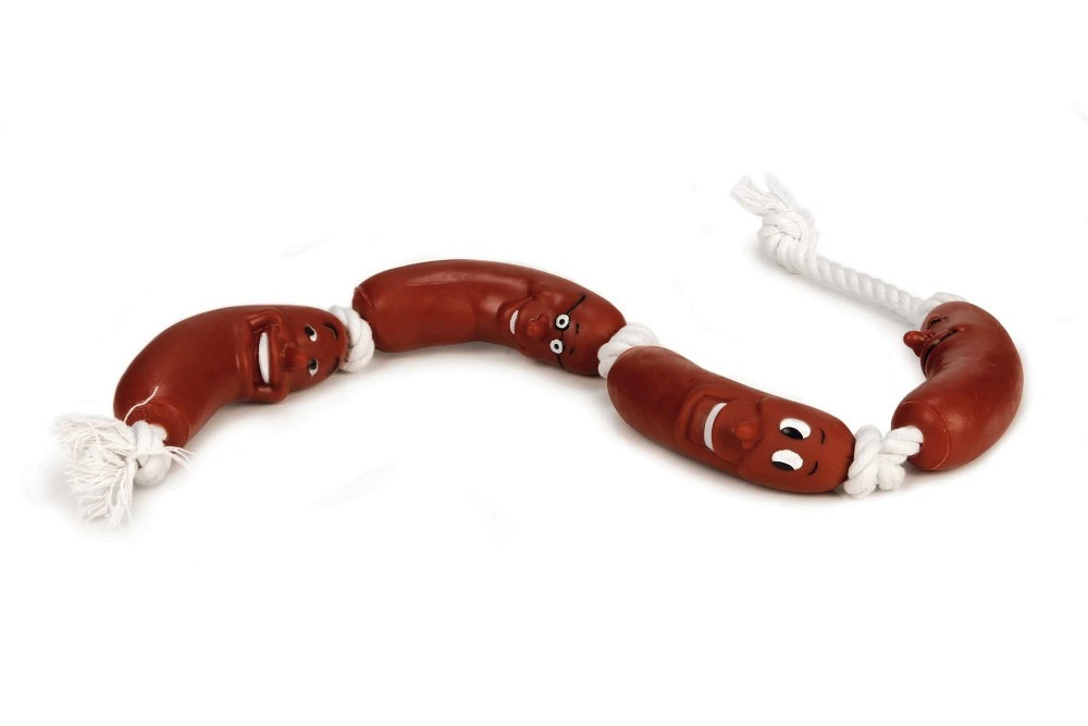 Grappig hondenspeeltje in de vorm van vier worstjes aan een touw.
