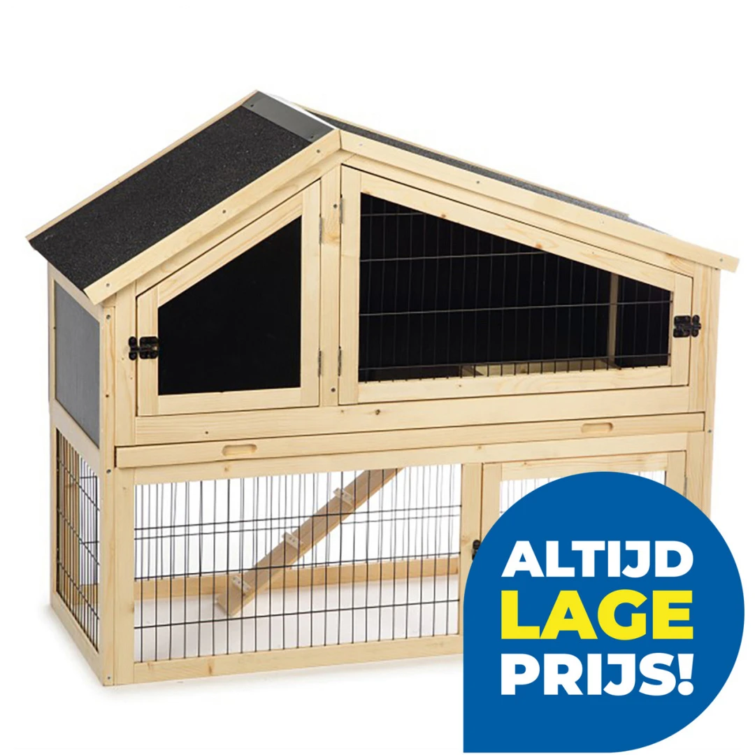 De Beeztees houten konijnenkooi Durka is een mooie buitenwoning voor jouw konijn. Deze kooi bestaat uit twee verdiepingen, waarvan de onderste verdieping een ren bevat over de gehele breedte van de kooi.