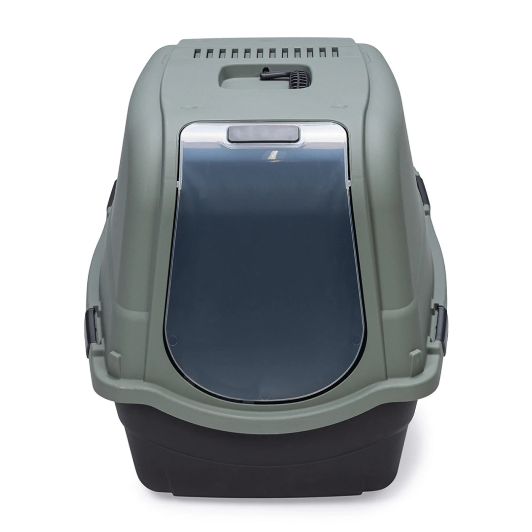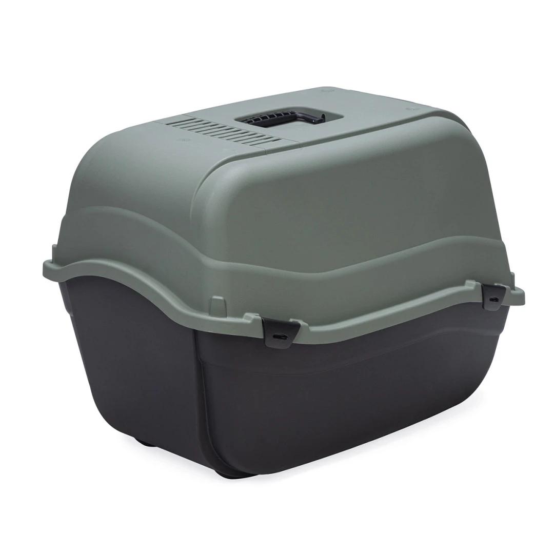De gesloten en grote Beeztees Romeo Maxi kattenbak is ecologisch verantwoord omdat deze is gemaakt van 100% gerecycled materiaal. De kattenbak is voorzien van een grote deur aan de voorkant en heeft geen filter. Om de kattenbak schoon te maken haal je de deksel via de sluitingen eenvoudig los. Het handvat zorgt ervoor dat je de deksel gemakkelijk op kunt tillen. Deze kattenbak beschikt over een transparante deur, waardoor jouw kat tijdens het doen van zijn of haar behoefte de omgeving in de gaten kan houden. Wil je jouw kat langzaam laten wennen aan de dichte kattenbak met deur? Dan kan de deur of de kap ook worden verwijderd. Zo creeer je tijdelijk een open kattenbak, wat voor sommige katten minder spannend is om te betreden.