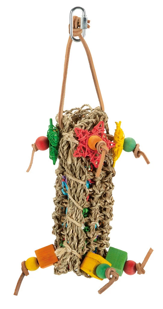 Vogelspeelgoed gemaakt van gebreid gras. Bevat gekleurde blokjes en kralen voor extra speelplezier.