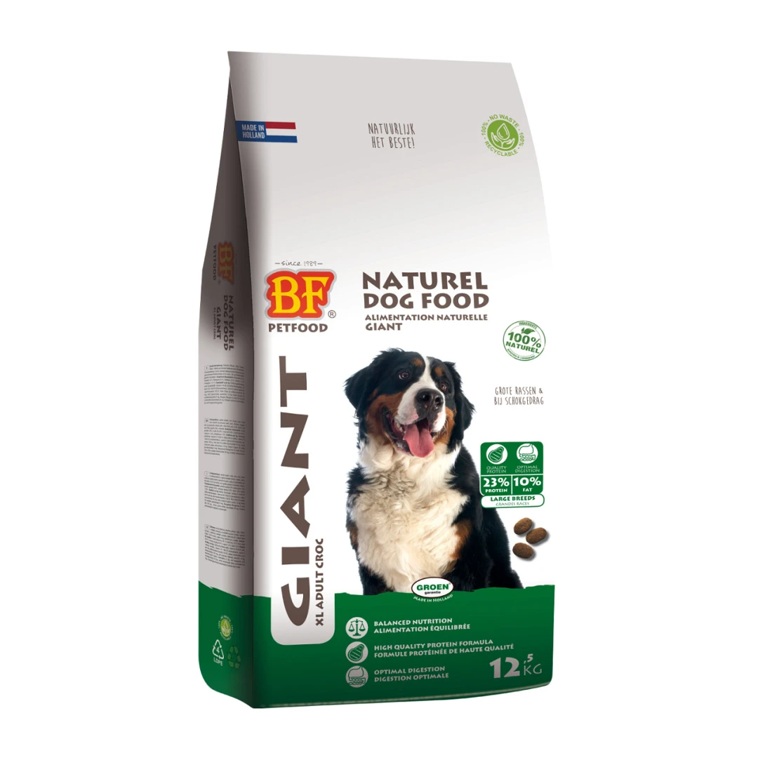 BF Petfood GIANT is een volledige licht verteerbare, premium en zeer smaakvolle hondenvoeding voor grote rassen en honden met schrokgedrag. Hoge acceptatie en verteerbaarheid. Met diverse dierlijke eiwitten. Ondersteund huid, vacht, gewrichtsfunctie, vitaliteit en de natuurlijke weerstand. Optimale voeding die zorgt voor een betere vertering, ontlasting en een goede conditie van jouw hond. Voor alle grote hondenrassen en honden met schrokgedrag.