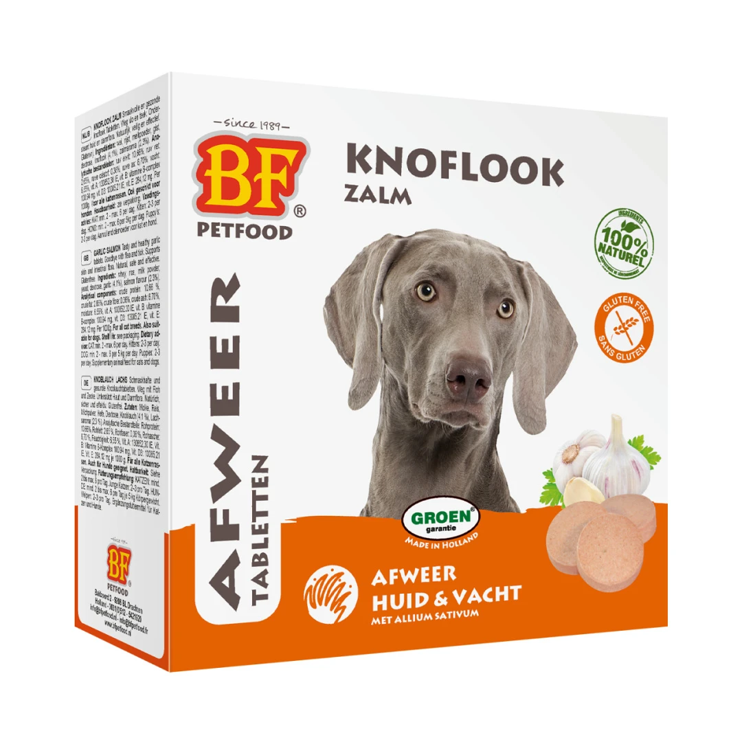 BFPetfood smaakvolle en natuurlijk koud geperste knoflook tabletten met zalmaroma, knoflook, aminozuren, vitaminen (A, B, D en E) en mineralen. Met de natuurlijke werking van knoflook. Natuurlijk en effectief. Maakt de hond als gastheer minder aantrekkelijk. Premium product zonder chemische toevoegingen. Ondersteunt afweer, huid, vacht (o.a. haaruitval) en darmflora. Glutenvrij. Het (Bier)gist bevat naast vitamine B(-complex) en vitamine D ook hoogwaardige en gezonde aminozuren, mineralen, eiwitten en enzymen. Optimale werking bij dagelijks gebruik. Voor alle hondenrassen, van puppy tot senior.