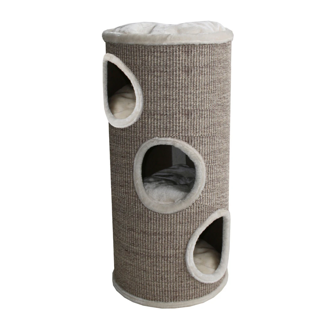 Robuuste sisal krabton met zachte pluchen kussens en drie in-/uitgangen. Afm. 42 x 42 x 100 cm.