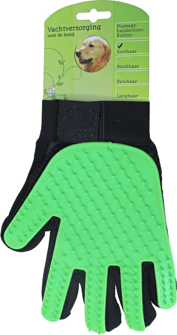 De rubber massage handschoenborstel is een vijfvingerige handschoen met zachte soepele silicone noppen. Je hoeft alleen nog maar je huisdier te aaien. Het helpt je het losse haar uit de vacht van je huisdier te halen. Het haar blijft in de handschoen plakken. Je hoeft het alleen nog eruit te halen en weg te gooien. Het borstelen en de aaibeweging geeft een aangename massage aan je huisdier. Voor gemakkelijk, prettig en veilig borstelen. Ideaal voor honden én katten.