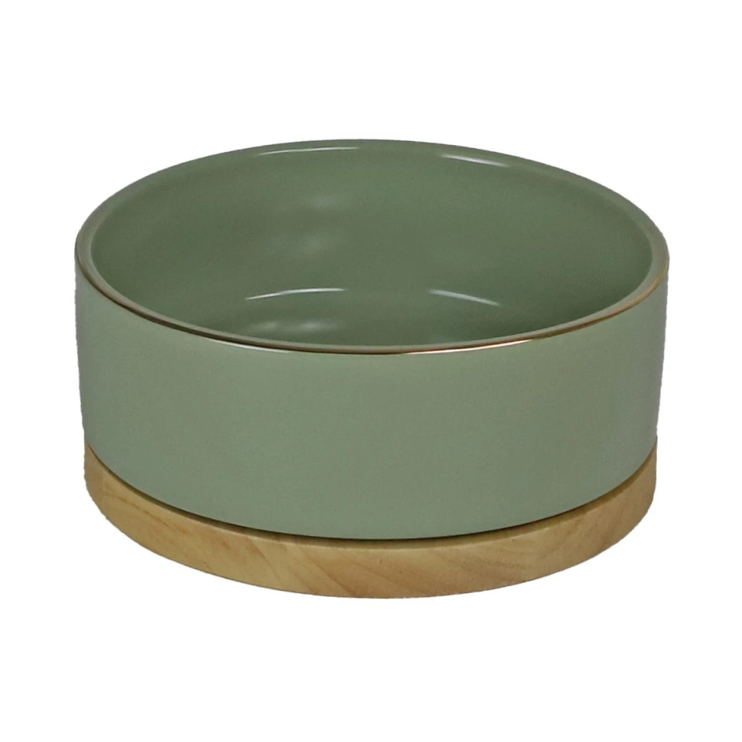 Mooie voer- en drinkbak met houten voet en matte afwerking.
