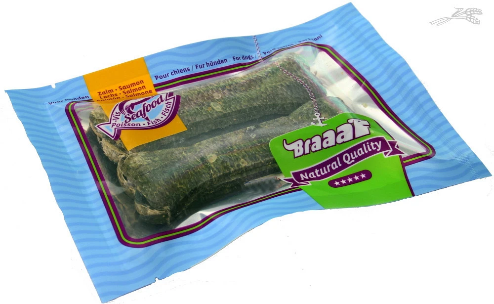Braaaf geperste zalmhuid voor een hond met gevoelige darmen, een minder glanzende vacht of gewoon een fijnproever. Braaaf heeft de eerste kauwkluiven van 100% vis! Het neusje van de zalm, dat zijn de 100% vissnacks van Braaaf! Bij vissnacks denk je misschien niet direct aan honden, maar ze zijn er dol op. Deze vissnacks hebben een hoge acceptatiegraad en zitten vol goede bestanddelen voor je hond. Ze bestaan uit slechts 3,8% vet en bevatten essentiële omega 3-vetzuren. Nog belangrijker, ze hebben geen toegevoegde kleur- of smaakstoffen.