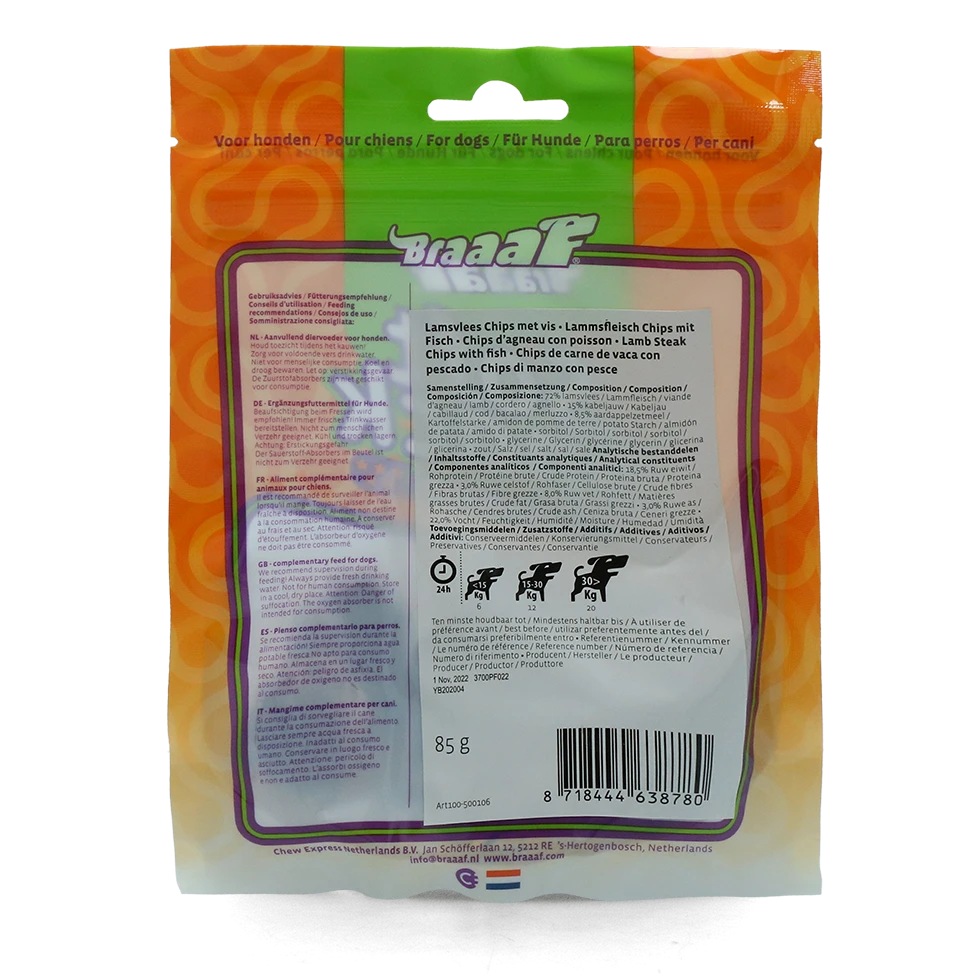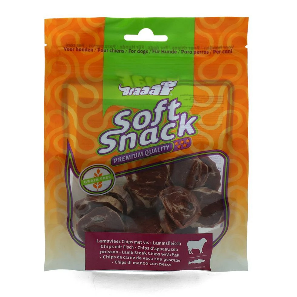 Braaaf lam steak chips met vis zijn simpelweg onweerstaanbaar voor iedere hond. Ze blijven lekker lang vers vanwege de hersluitbare verpakking. Deze zachte snacks zijn ideaal in te zetten tijdens trainingen, maar ook op ieder ander moment van de dag te gebruiken. Door de zachte structuur zijn de snacks geschikt voor honden van alle leeftijden, van puppy tot senior. De combinatie van vlees met vis, maakt deze snacks een smakelijke beloning.