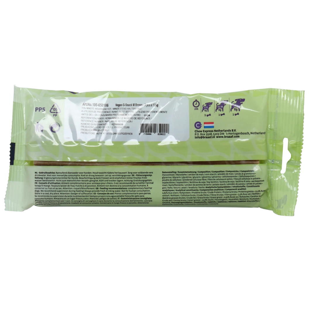 Kies je voor Braaaf Vegan Snack G, dan kies je voor een gezond, hygiënisch, verpakt product. Een hond kan niet zelf bepalen wat het beste voor hem is, dat is aan jou! Deze snacks bevatten geen dierlijke producten, zijn stankvrij, geschikt bij allergieën en hebben een hoge acceptatiegraad. Daarnaast zorgt de textuur van de vegan snacks voor veiliger kauwen.