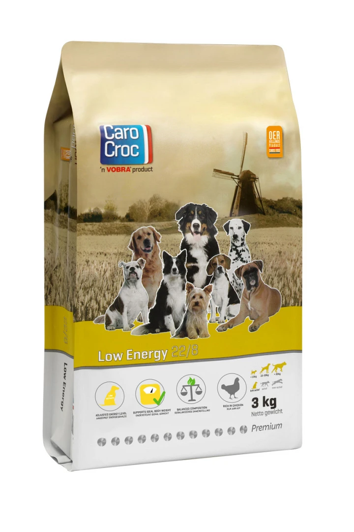 CaroCroc Low Energy is volledig voer voor volwassen honden met relatief weinig lichamelijke inspanning (wandelen en spelen) die neigen naar overgewicht (bijvoorbeeld Labrador en Golden Retriever) of gecastreerd/gesteriliseerd zijn.