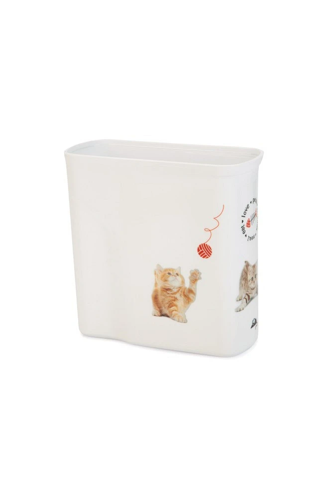 De container bevat een handige opening aan de bovenkant, zodat je de brokjes gemakkelijk in een kattenvoerbak kunt schenken. Leuk detail: voorzien van diverse kattenprints.