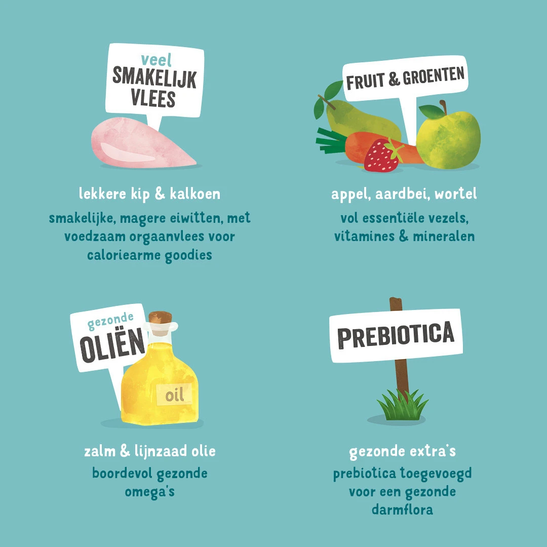 • Kip en kalkoen met proteïnes van hoge kwaliteit voor een gezond immuunsysteem en mager vlees lager in calorieën