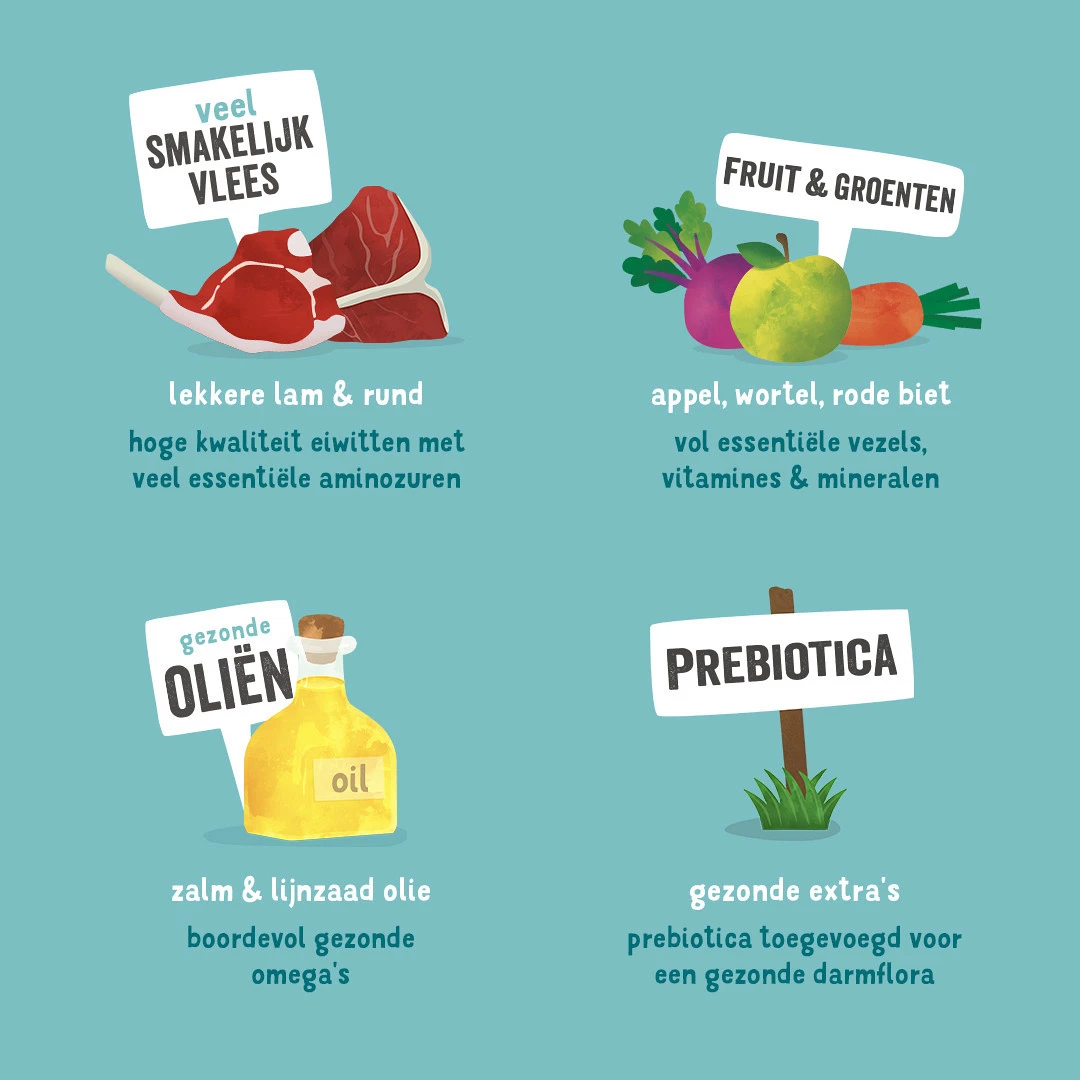 Samenstelling: lam 30%, rund 30%, wortel 2%, mineralen, mannan-oligosachariden (MOS), broccoli (gedroogd) 0,25%, rode bieten (gedroogd) 0,25%, lijnzaadolie, fructo-oligosachariden (FOS), zalmolie, appels (gedroogd) 0,06%, peer (gedroogd) 0,05%, banaan (gedroogd) 0,05%, bosbessen (gedroogd) 0,05%, gedroogde venkel 0,01%, gedroogd karwijzaad 0,01%, gedroogd duizendblad 0,01%, gedroogde braambessenblaadjes 0,01%, gedroogde maretak 0,01%, gedroogde kamillebloesem 0,01%, gedroogde gentiaanwortel 0,01%, gedroogd duizendguldenkruid 0,01%