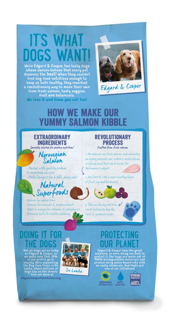 In Edgard & Cooper hondenvoer Adult Noorse zalm wordt enkel verse Noorse zalm gebruikt en absoluut geen bewerkte, overgare of gedroogde zalm of zalmmeel dat moeilijker is voor de buikjes om te verteren. Daarnaast wordt er een supergezonde mix van fruit, groenten en kruiden toegevoegd.