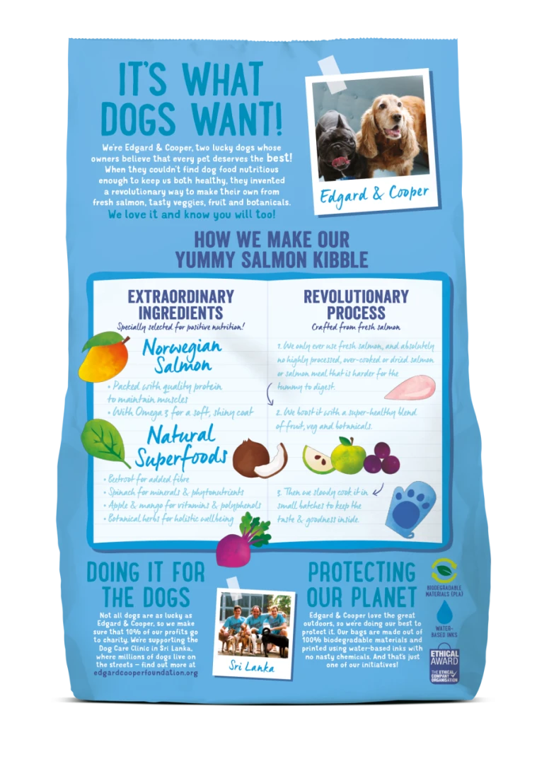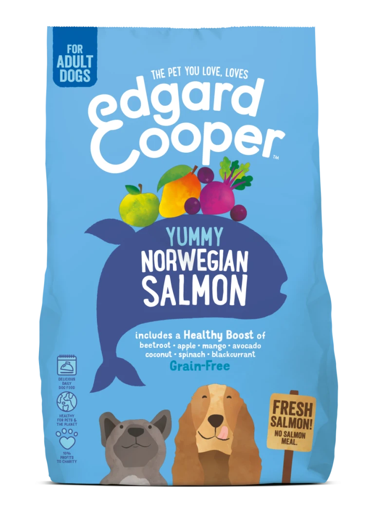 In Edgard & Cooper hondenvoer Adult Noorse zalm wordt enkel verse Noorse zalm gebruikt en absoluut geen bewerkte, overgare of gedroogde zalm of zalmmeel dat moeilijker is voor de buikjes om te verteren. Daarnaast wordt er een supergezonde mix van fruit, groenten en kruiden toegevoegd.