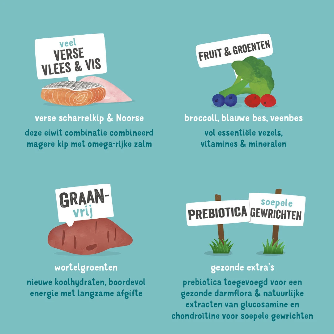 • Verse scharrelkip is lager in calorieën voor minder energieke honden