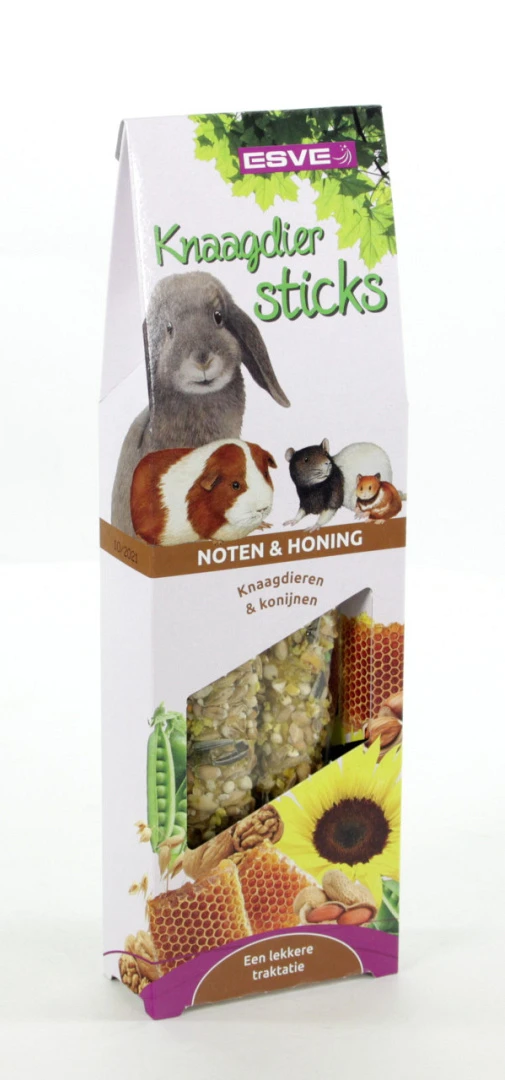 ESVE Knaagdiersticks Noten en Honing zijn smaakvolle voedings- en traktatie stangen, boordevol belangrijke voedingsstoffen, geheel afgestemd op de behoefte van jouw konijn/knaagdier.