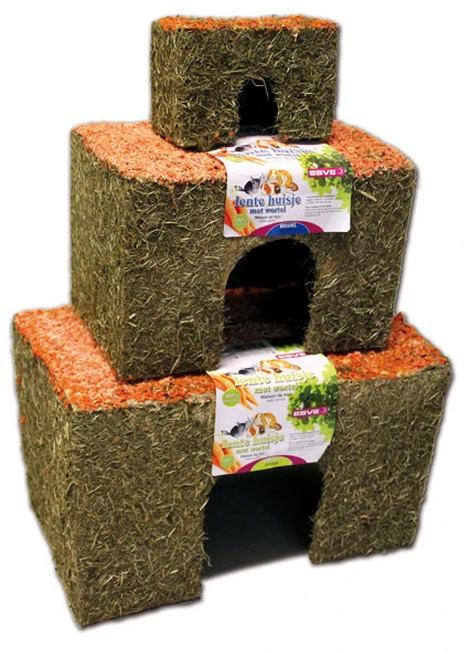De huisjes zijn gemaakt van natuurlijke materialen en zorgen ervoor dat uw konijn of knaagdier zich niet meer hoeft te vervelen. Het huis is bedekt met graszaden, hooi en een dak van wortel.