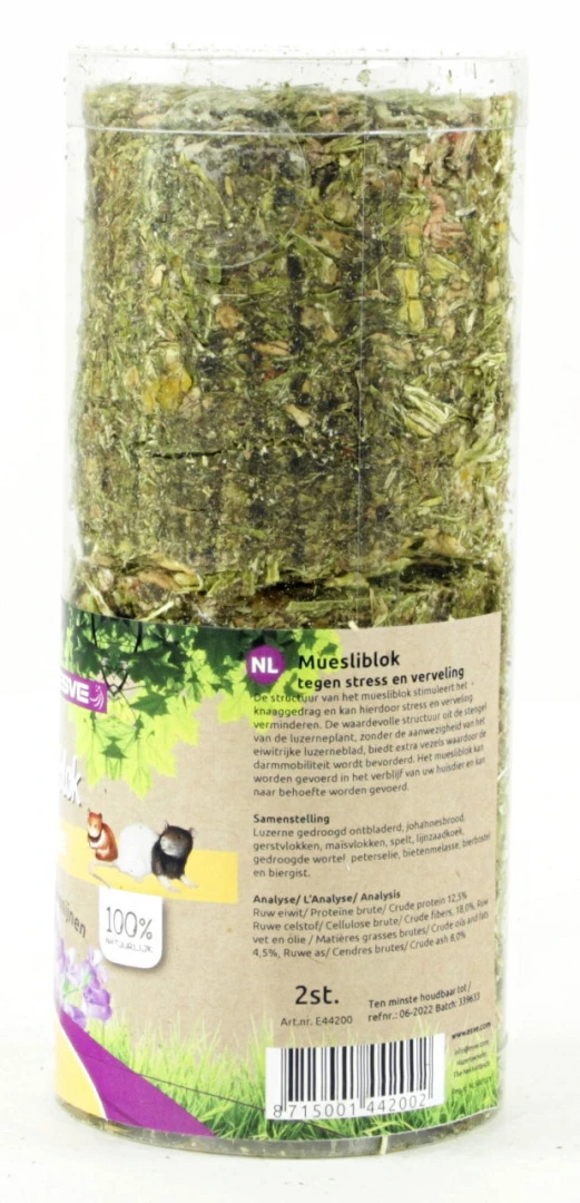 ESVE Muesliblok Knaagdieren stimuleert het knaaggedrag en kan hierdoor stress en verveling verminderen. De waardevolle structuur uit de stengel van de luzerneplant, zonder de aanwezigheid van het eiwitrijke luzerneblad, biedt extra vezels waardoor de darmmobiliteit wordt bevorderd.