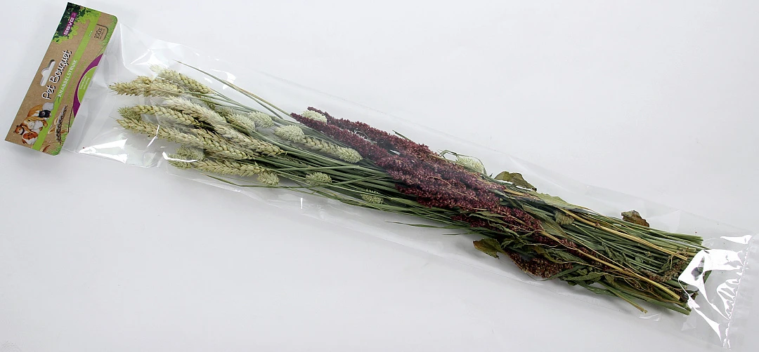 De gevarierde mix van granen, grassen en kruiden kun je in het verblijf leggen of hangen. Het staat niet alleen mooi, maar het voorziet het dier in zijn natuurlijke knaagbehoefte en gaat bovendien verveling tegen.