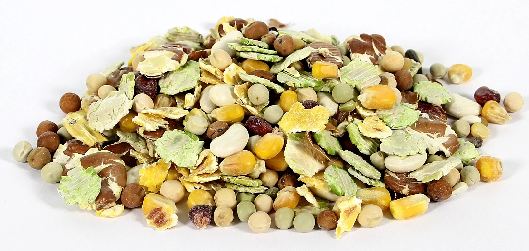 Smakelijk recept van bonen, erwten en maïs voor papegaaien.