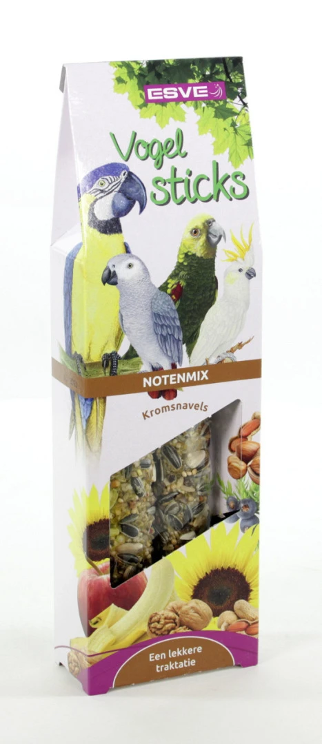 De ESVE Vogelsticks Papegaai Noten Mix zijn smaakvolle voedings- en traktatiesticks, boordevol belangrijke voedingsstoffen, geheel afgestemd op de behoefte van uw vogel(s).