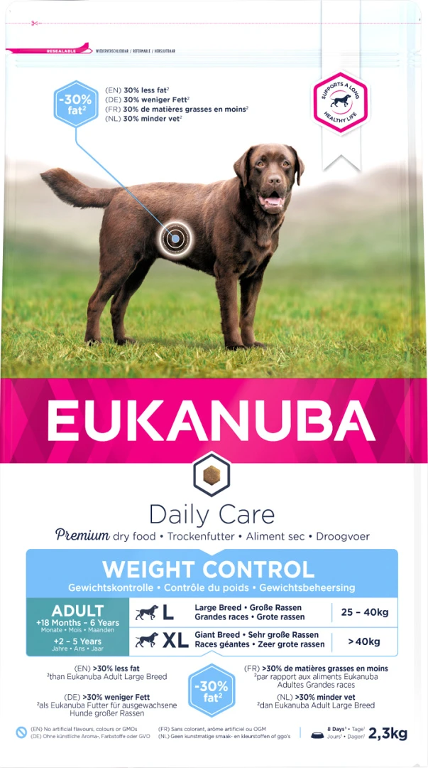 Eukanuba Adult Large Weight Control voor volwassen grote honden bevat 30% minder vet (in vergelijking met Eukanuba Adult Large Breed) om te helpen lichaamsvet te verminderen met behoud van vetvrij spierweefsel. De aanvullende, toegevoegde L-carnitine ondersteunt een gezond gewicht en vermindert de druk op gewrichten.