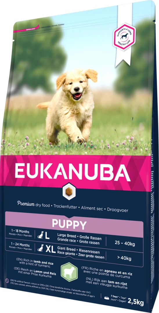 Eukanuba Puppy L/XL Lamb & Rice is een voeding speciaal afgestemd op de behoeften van pups en jonge van 1 tot 12 maanden oud van alle rassen.