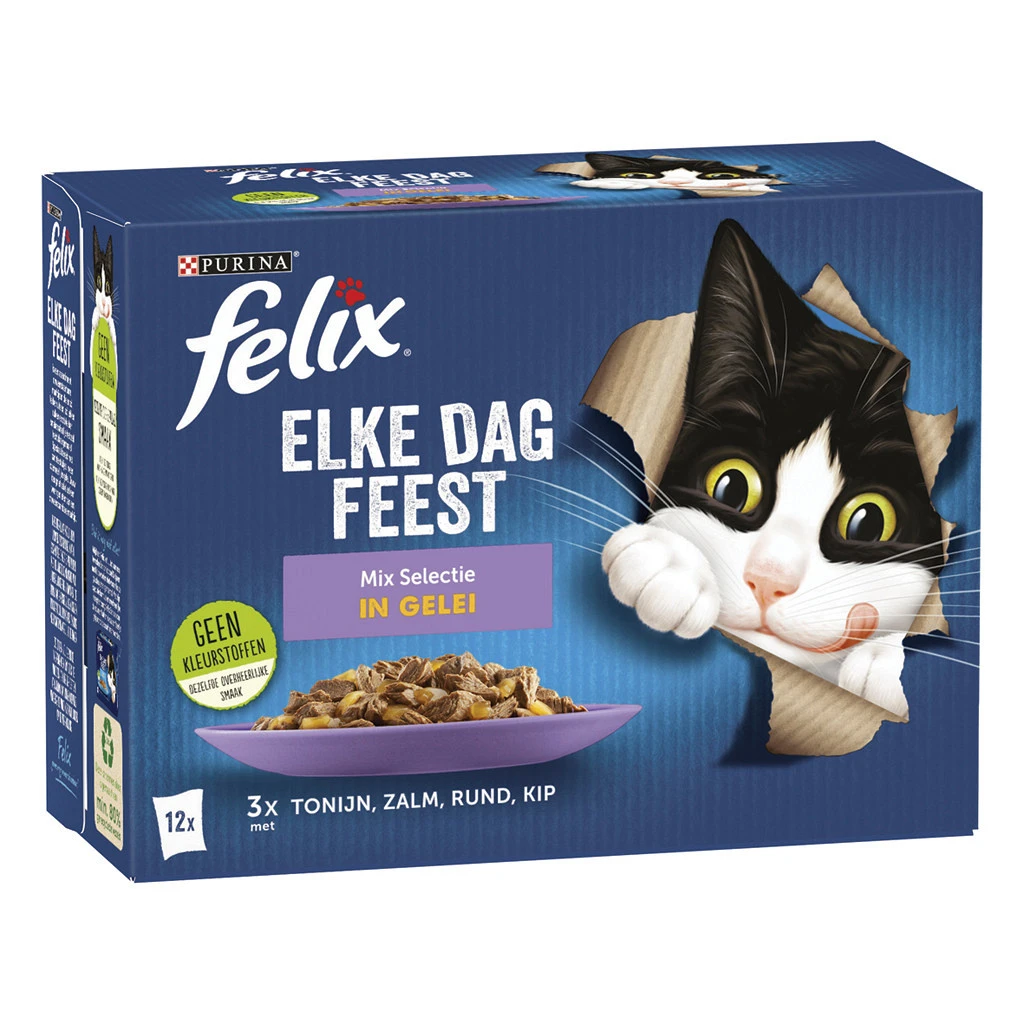Felix Elke Dag Feest Mix Selectie in gelei zijn onweerstaanbare maaltijden die er zó lekker uitzien en zó lekker ruiken alsof je het zelf hebt klaargemaakt. Elke maaltijd bevat malse stukjes in een heerlijke gelei, voor een onweerstaanbare maaltijd voor jouw kat. Felix Elke Dag Feest is een assortiment van heerlijke maaltijden om jouw kat de variatie te bieden waar hij zo van houdt.