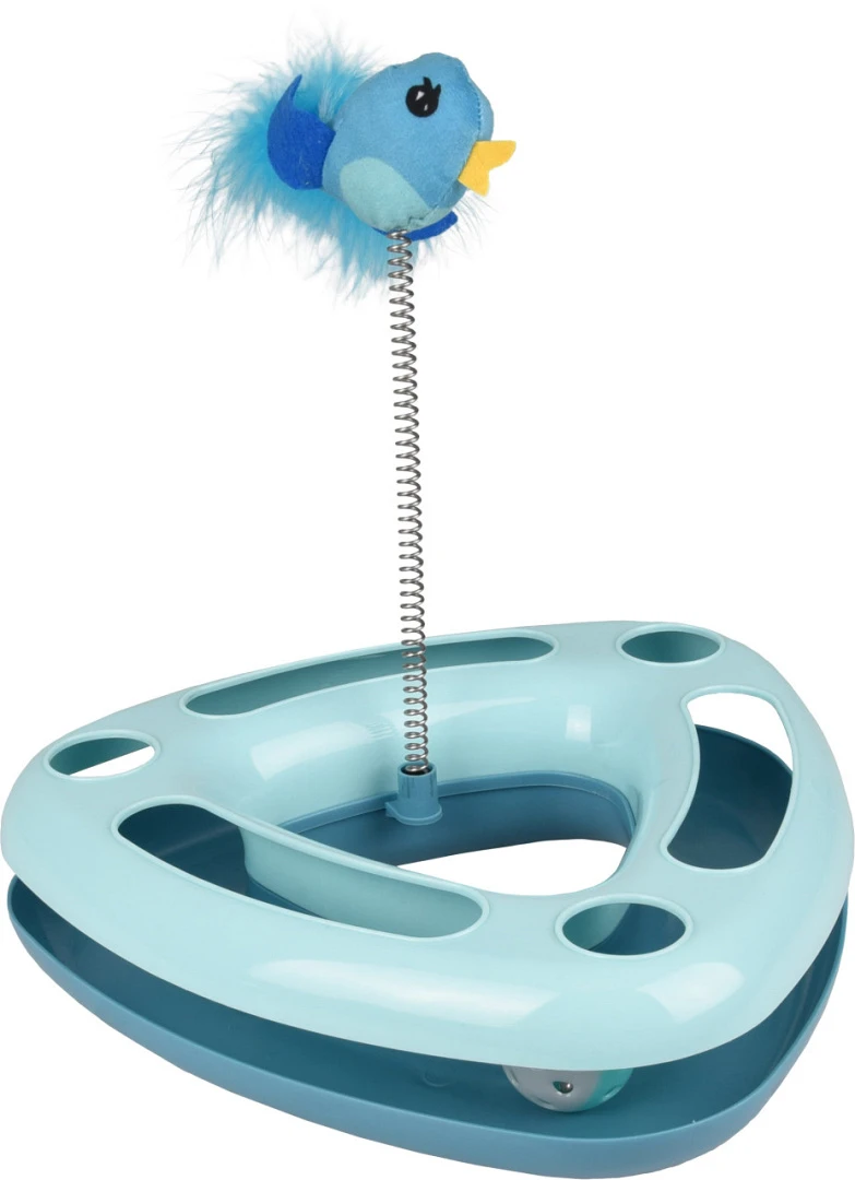 Het Flamingo kattenspeelgoed Felicia driehoek is een leuke ballenbaan met rinkelend balletje en vogel op springveer. Het speelgoedvogeltje bevat catnip, wat dit speeltje extra aantrekkelijk maakt. Eindeloos plezier doordat het balletje niet uit de baan kan. De rubberen voetjes houden de vloer krasvrij en het speeltje blijft mooi staan.