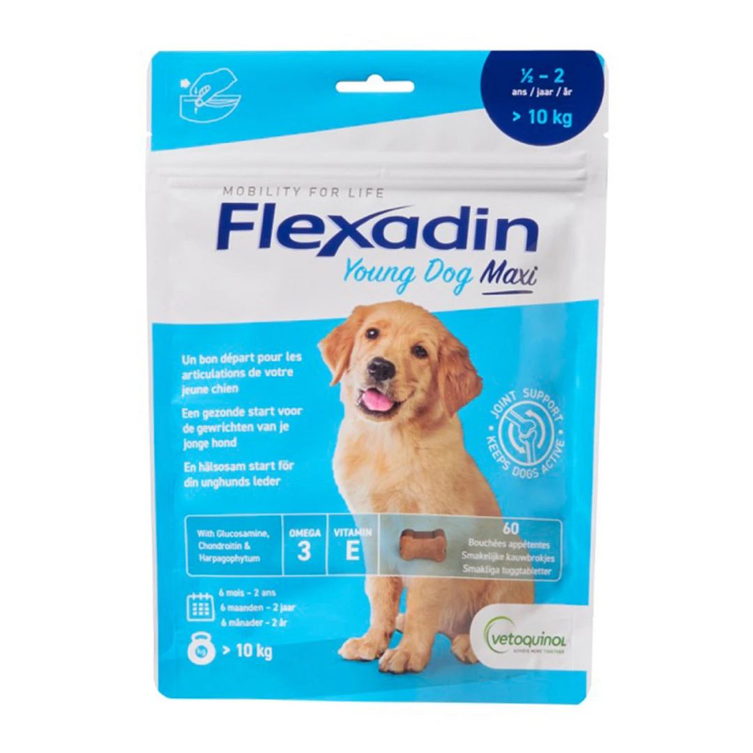 Flexadin Young Dog Maxi Chews is een aanvullend diervoer ter ondersteuning van de gewrichten bij jonge honden.