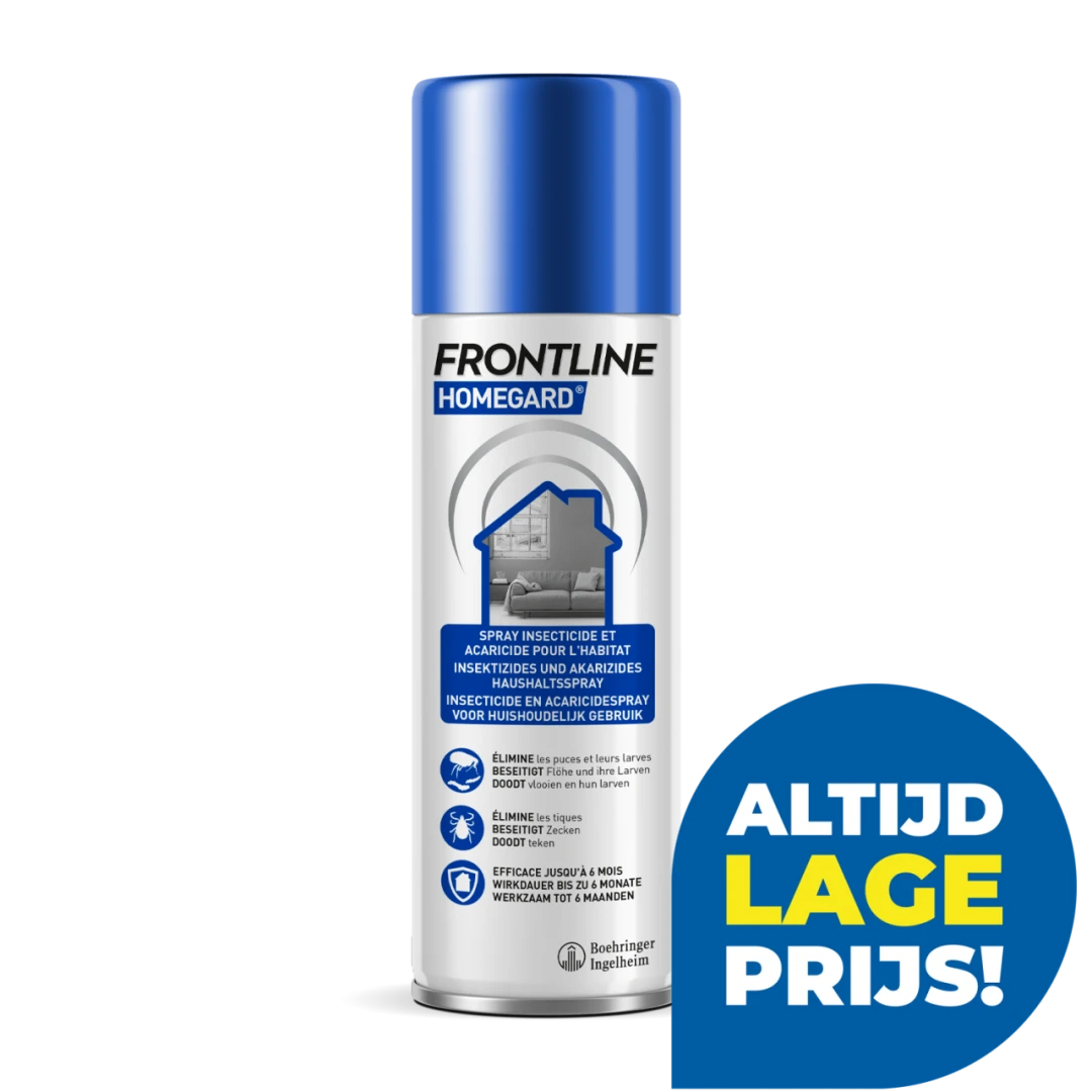 Frontline Homegard is een omgevingsspray voor in huis. De spray doodt vlooien en vlooienlarven en remt de ontwikkeling van de eitjes van deze vlooien voor de gedurende 6 maanden af.
