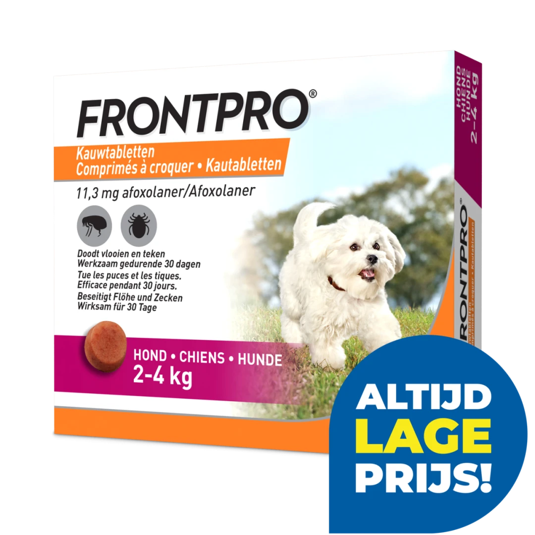 1 smakelijke kauwtablet beschermt je hond voor maar liefst 30 dagen en doodt vlooien voordat ze eitjes kunnen leggen. FRONTPRO is zeer makkelijk te geven, met of zonder eten. Van de makers van FRONTLINE.