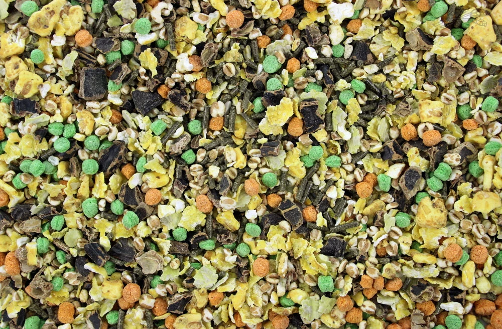 Samenstelling: Korrel [gerst, zonnepitschroot, gras/luzerne, haver, tarwe, tarwegries, sojaschroot[1], premix, lijnzaad, melasse, krijt, lysine, calcium, methionine, kruiden [1] geproduceerd met gmo sojabonen], johannesbroodm ontsloten mais, ontsloten tarwe, extrudaten, erwtenvlokken. Nutritionele toevoegingen per kg: Organische stof 141,33 gr, Vitamine A (E672) 7800 IE, Vitamine E 104 mg, Vitamine D3 (E671) 520 IE