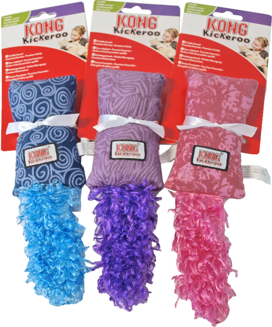 De maat, vorm en het materiaal van de Kickeroo stimuleren worstelen en het schoppen met de achterpoten. De pluizige staart zorgt voor extra enthousiasme en de ruime hoeveelheid sterk, Noord-Amerikaans kattenkruid van Kong zorgt voor nog meer speelplezier.