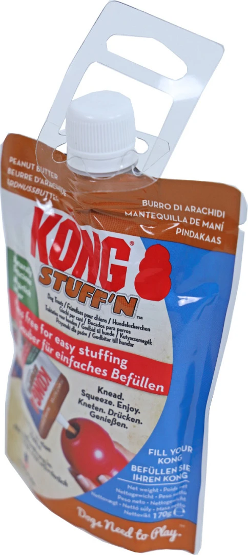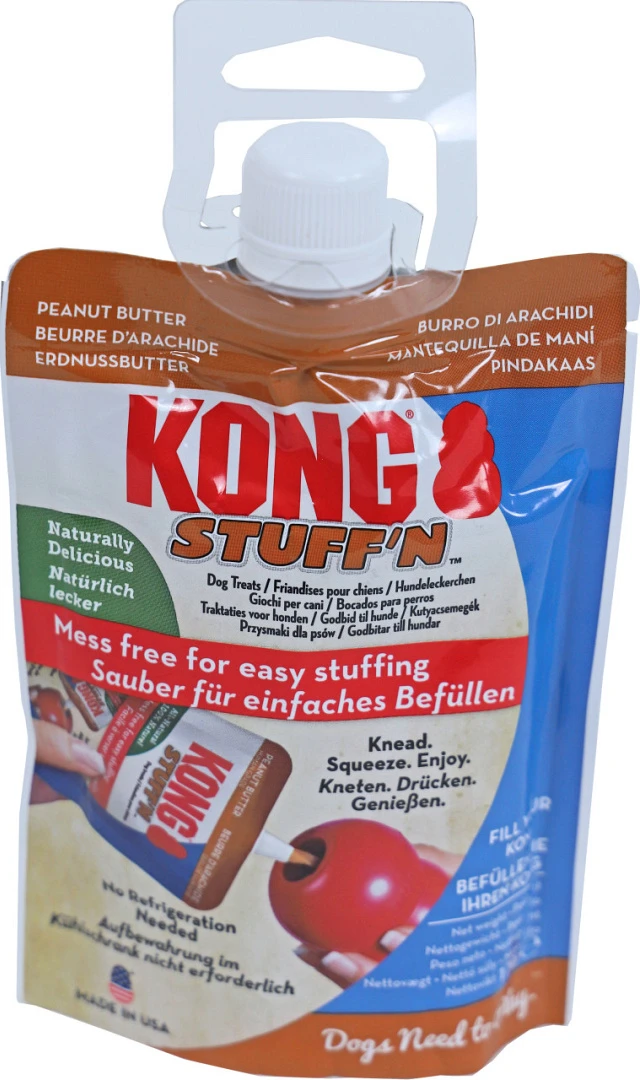 Kong Peanut Butter All Natural Pouch wordt geleverd in een handig zakje met een knoeivrij mondstuk voor het eenvoudig aanbrengen van de pindakaas. De pouch is gemaakt voor het eenvoudig vullen van een kauwspeeltje waar traktaties in verstopt kunnen worden en is ideaal om mee te nemen naar bijvoorbeeld de training. Verleng de uitdaging door het kauwspeeltje te vullen met de all natural pasta en deze 4 tot 6 uur in de vriezer te plaatsen.