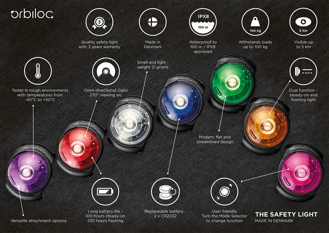 De Orbiloc Dog Dual heeft twee functies met lange batterijduur: constant licht en knipperlicht. Beweging wordt sneller geregistreerd door ogen, waardoor je met knipperlicht sneller wordt opgemerkt. Bij constant licht is het eenvoudiger om de afstand en de positie te bepalen, uitstekend dus voor gebruik in het verkeer. De batterij gaat bij constant licht 100 uur mee en bij knipperlicht 250 uur.