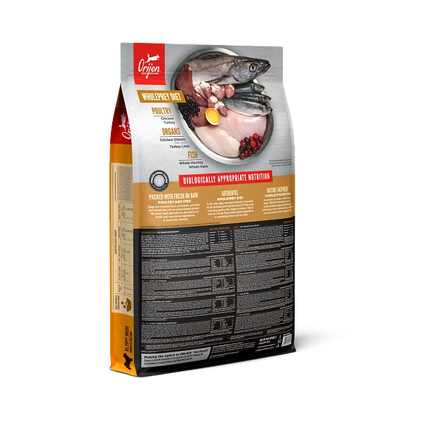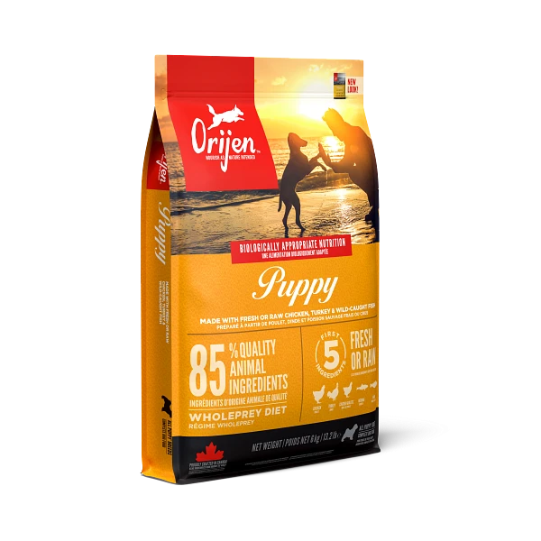Orijen hondenvoer Puppy is een puppyvoeder bereid met scharrelkippen en kalkoenvlees, scharreleieren en in het wild gevangen vis. Allen gekweekt of gevangen in onze eigen regio en dagelijks vers geleverd. Daardoor is deze voeding rijk aan hoogwaardige voedingsstoffen om jouw pup volledig te voeden.