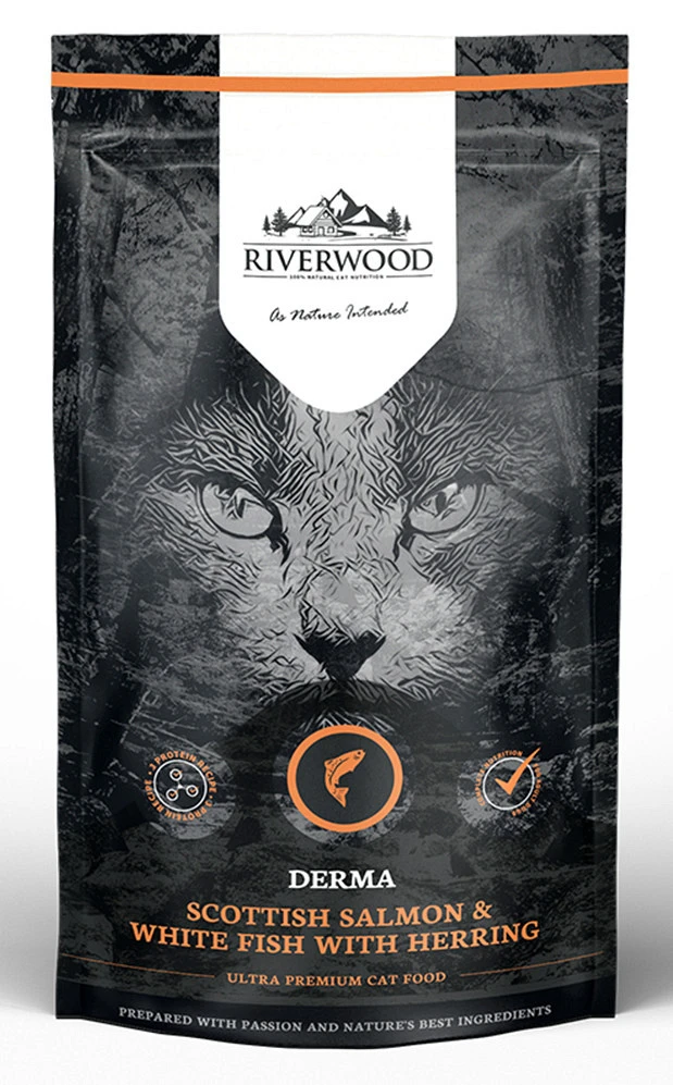 Voor katten met een speciale vacht heeft Riverwood een bijzonder vachtvriendelijke voeding ontwikkeld, namelijk Riverwood Derma. Om deze vaak half lang of lang harige katten hun vacht optimaal te ondersteunen is er bewust gekozen voor de eiwitbronnen Schotse zalm, witvis en haring, met een hoog gehalte aan omega-3 vetzuren. De vacht van jouw kat is immers de spiegel van zijn gezondheid.