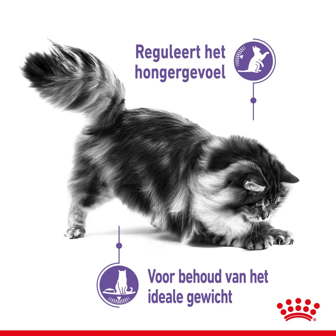 Royal Canin kattenvoer Appetite Control Care is een complete voeding voor gesteriliseerde volwassen katten die de neiging hebben om te bedelen. Appetite Control Care is ontworpen met een aangepast vet- en energiegehalte. Een optimale combinatie van oplosbare en onoplosbare voedingsvezels zorgt ervoor dat de spontane energie-inname afneemt, terwijl het je kat helpt een vol en verzadigd gevoel te geven.