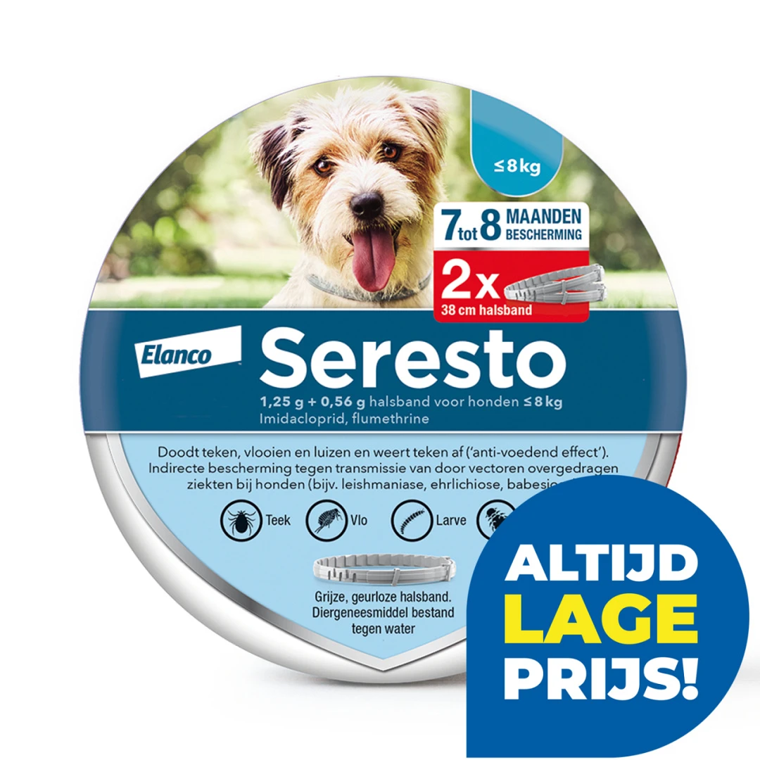 Seresto band voor kleine honden is een innovatieve halsband tegen vlooien en teken jouw hond. Behandeling en preventie van vlooienbesmettingen gedurende 7 tot 8 maanden. De werkzaamheid tegen vlooien start onmiddellijk na het aanbrengen van de halsband. Seresto heeft een persisterende acaricide (dodelijke) doeltreffendheid tegen tekenbesmettingen (Ixodes ricinus, Rhipicephalus sanguineus) en afwerende (antivoedende) doeltreffendheid tegen tekenbesmettingen (Ixodes ricinus, Rhipicephalus) gedurende 8 maanden. De preventie van besmettingen met nieuwe teken start binnen de twee dagen na het aanbrengen van de halsband.