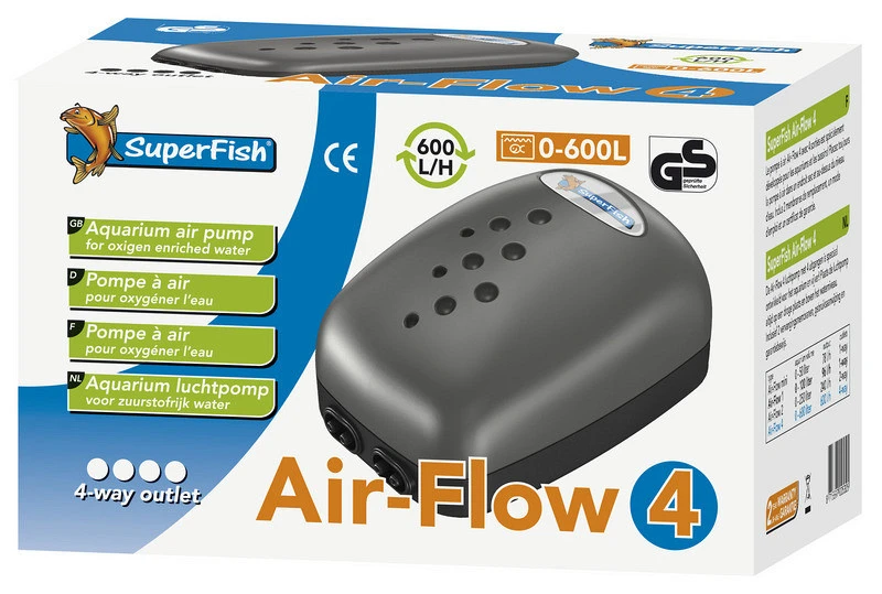 De SuperFish Air-Flow 4 way luchtpomp heeft vier uitlaten met regelbare luchtstroom en is speciaal ontwikkeld voor aquaria. Hiermee krijgt je extra zuurstof in jouw aquarium.