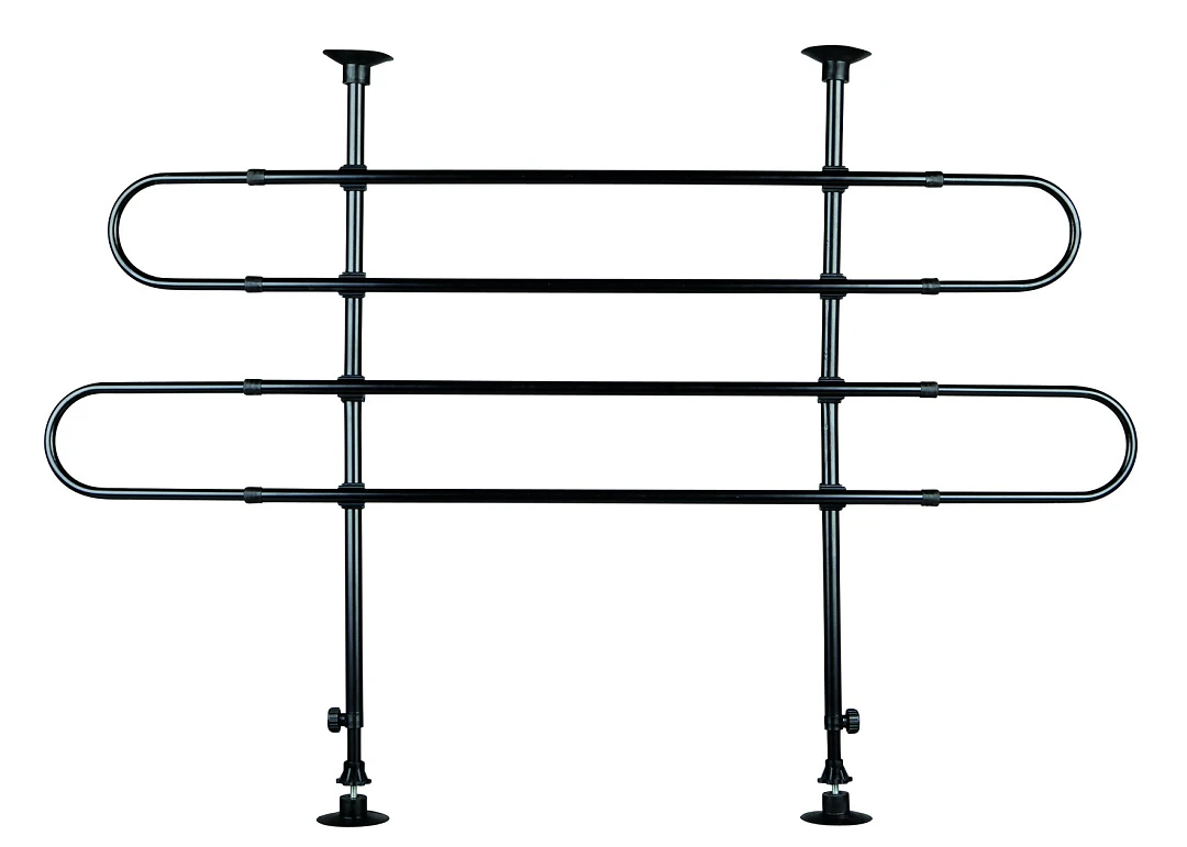 Metalen, tweedelig autorek voor het vervoeren van dieren of bagage in de kofferbak. Traploos verstelbaar in breedte en hoogte.