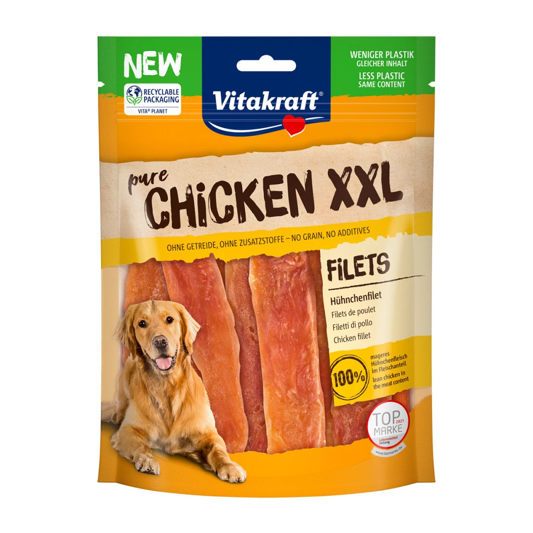Vitakraft Chicken XXL Kipfilet is een vleessnack die gegarandeerd in de smaak vallen bij jouw hond! Met de Pure Chicken geef je heerlijke kipfilets zonder toevoegingen. Dat betekent geen toegevoegde suikers, kunstmatige kleurstoffen, smaakversterkers en conserveringsmiddelen.