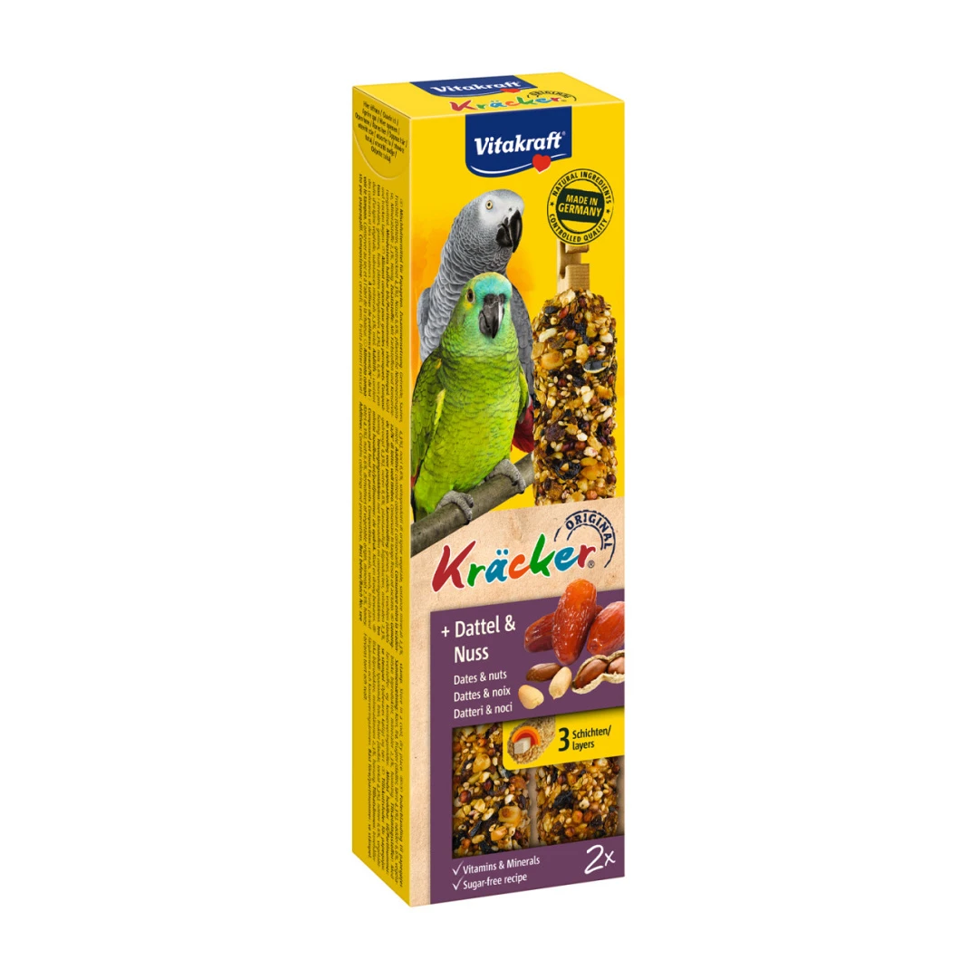 Vitakraft Kräcker Original papegaai met dadel en noot is een verantwoorde lekkernij en bevat lekkere zaden, granen, noten en dadels op een natuurlijk knabbelhoutje met houten clip.